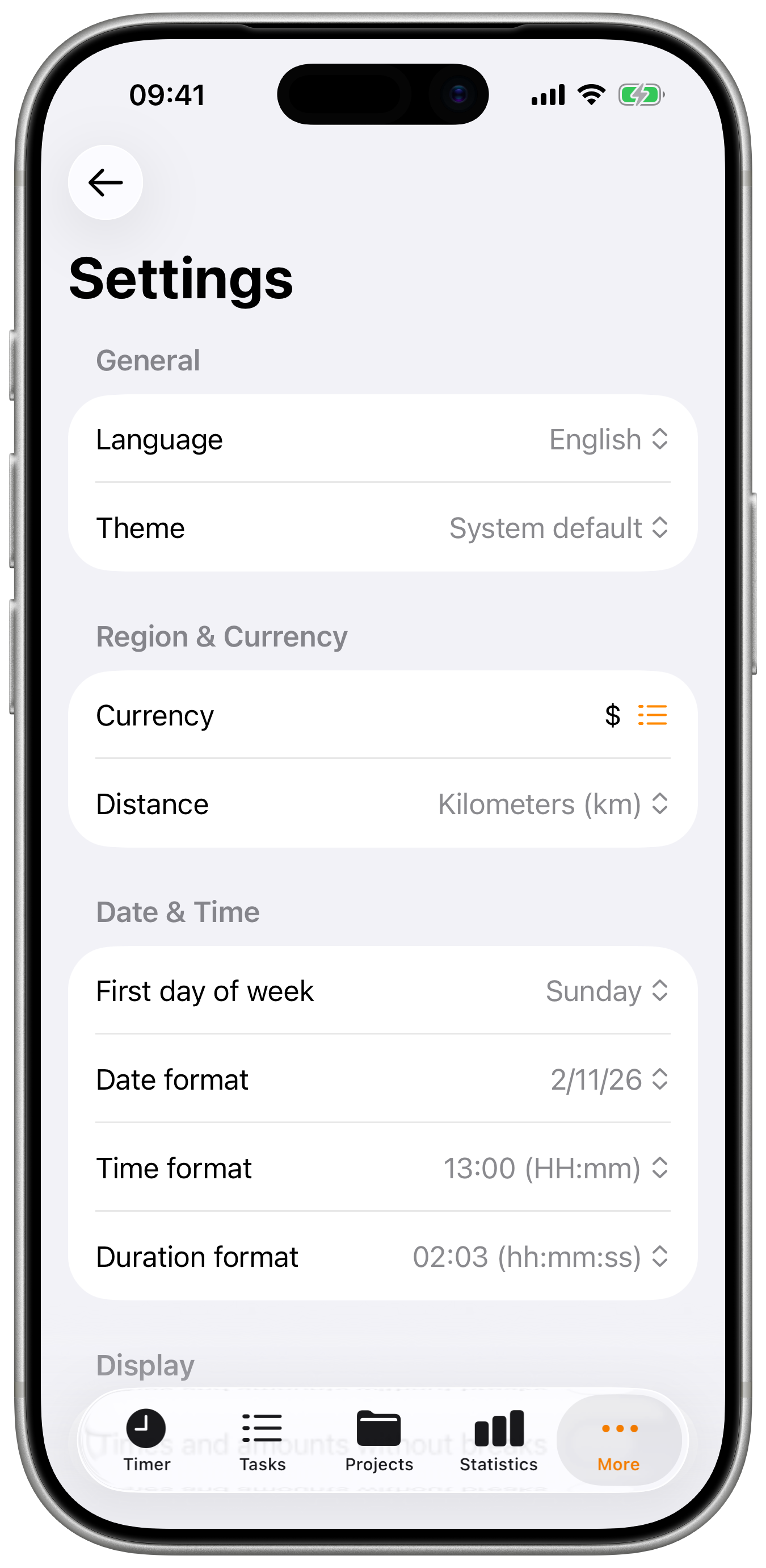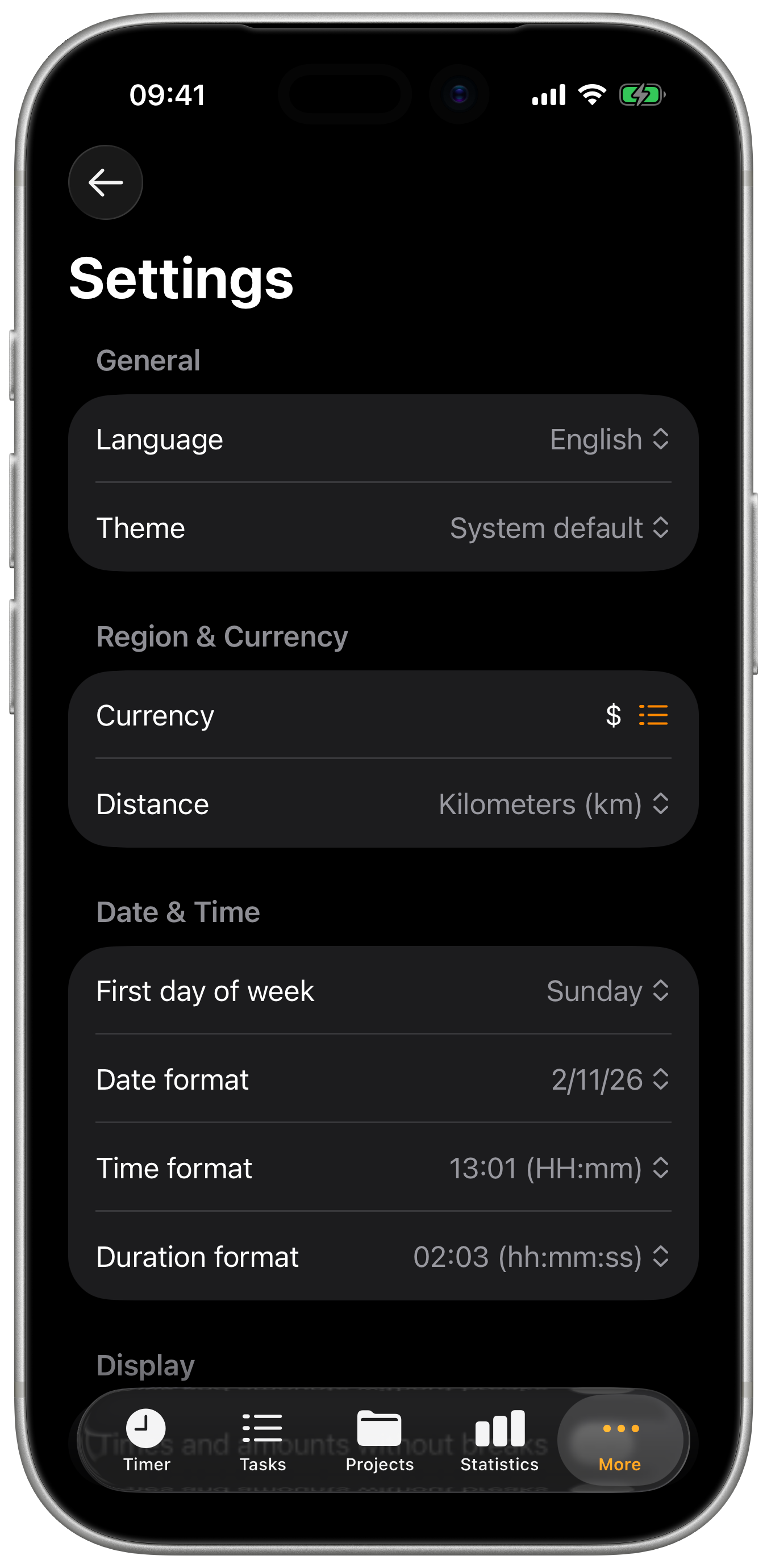 The Settings screen allows you to configure Timesheet to match your workflow. Customize formats, timer behavior, export options, and appearance to create your ideal time tracking experience.