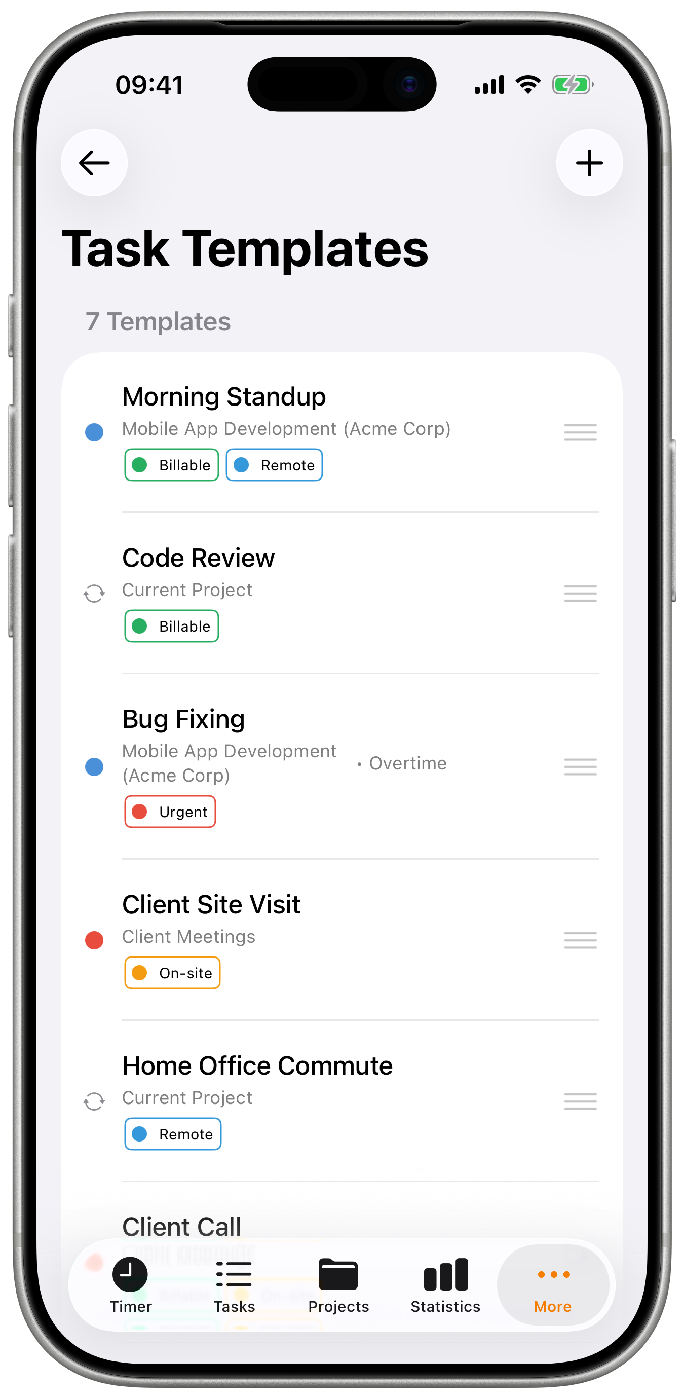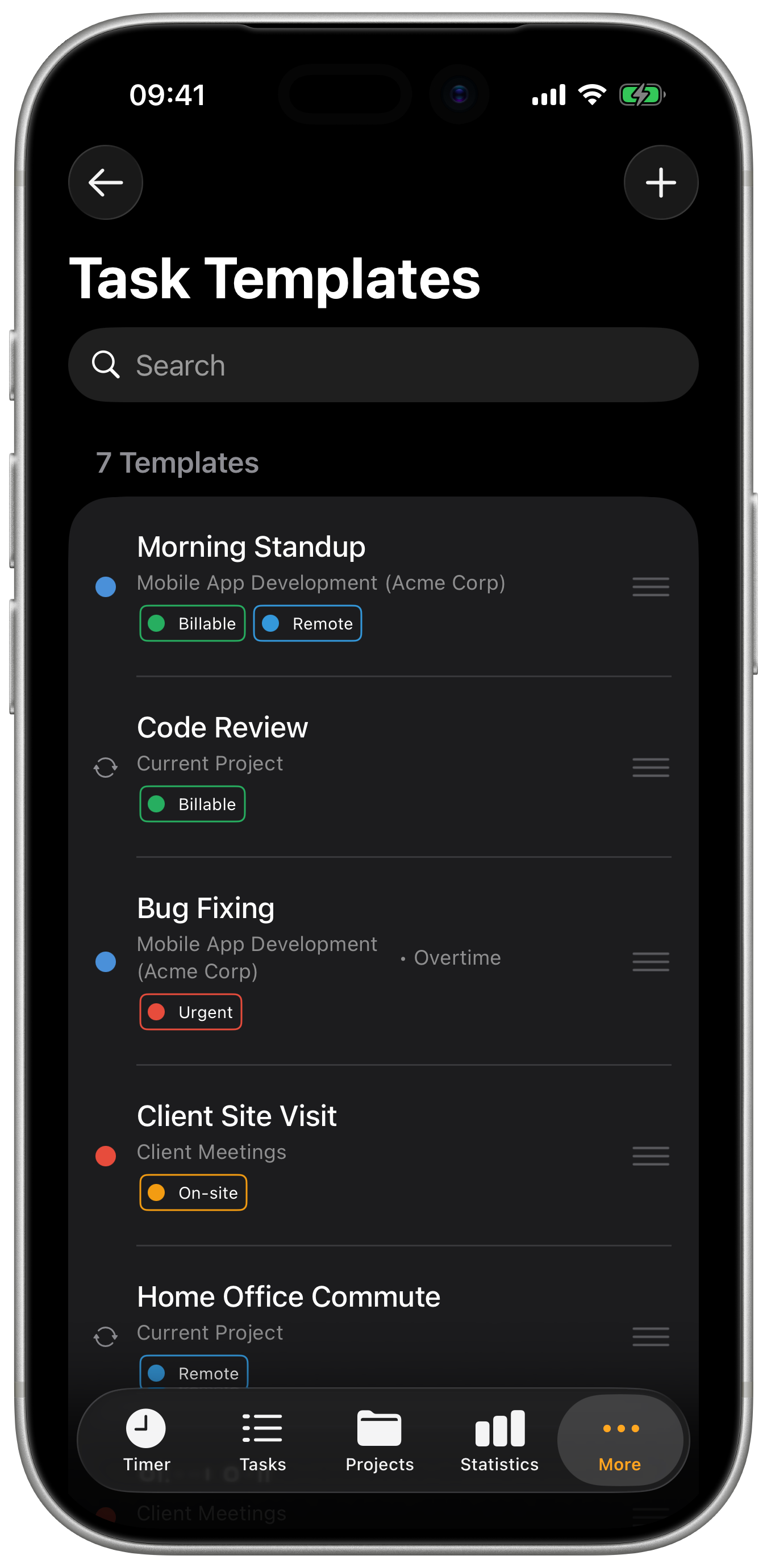 Templates streamline your time tracking workflow by eliminating repetitive setup. Create templates for your most common work activities and start tracking with a single tap.