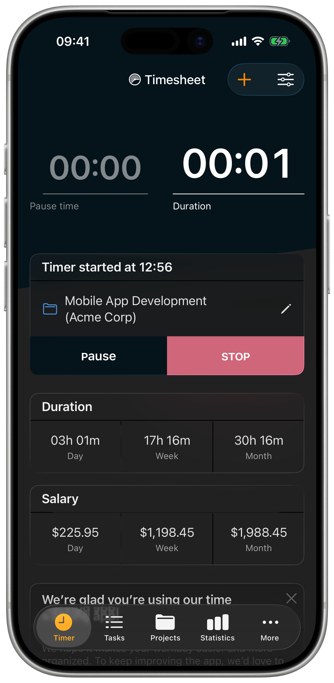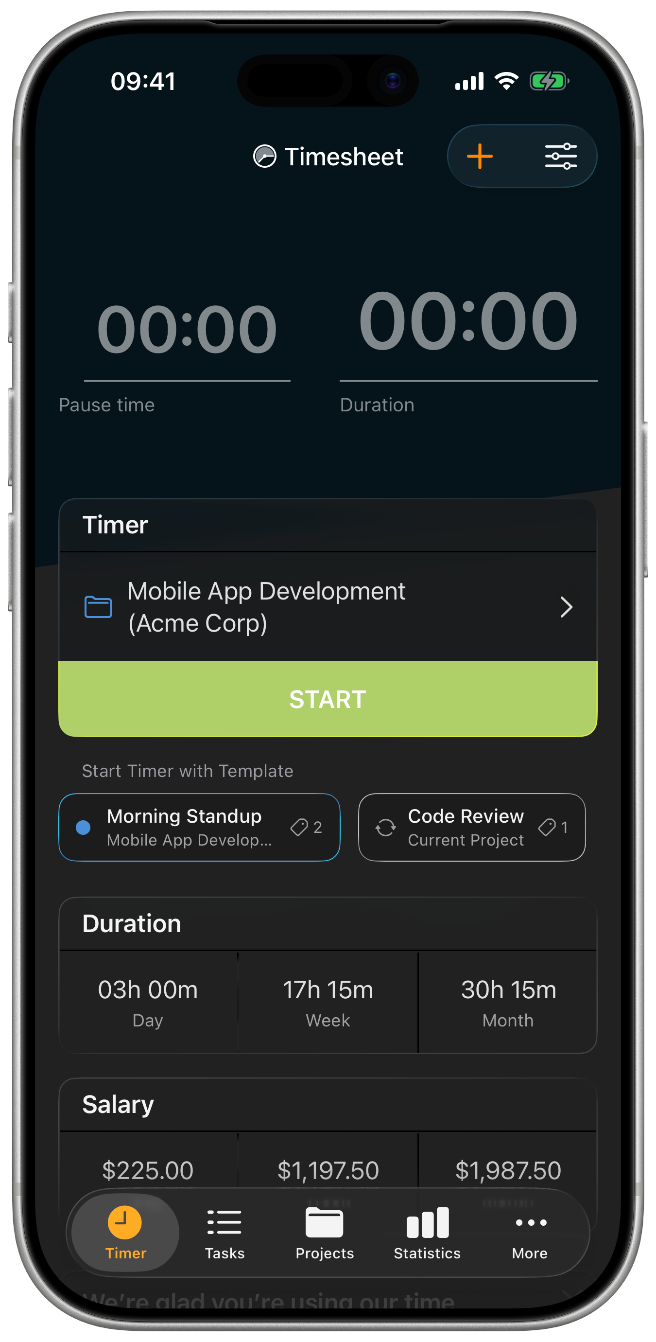 The Timer is your primary tool for tracking work sessions in real-time. Track time accurately, manage breaks, and monitor your productivity with quick statistics—all from one screen.